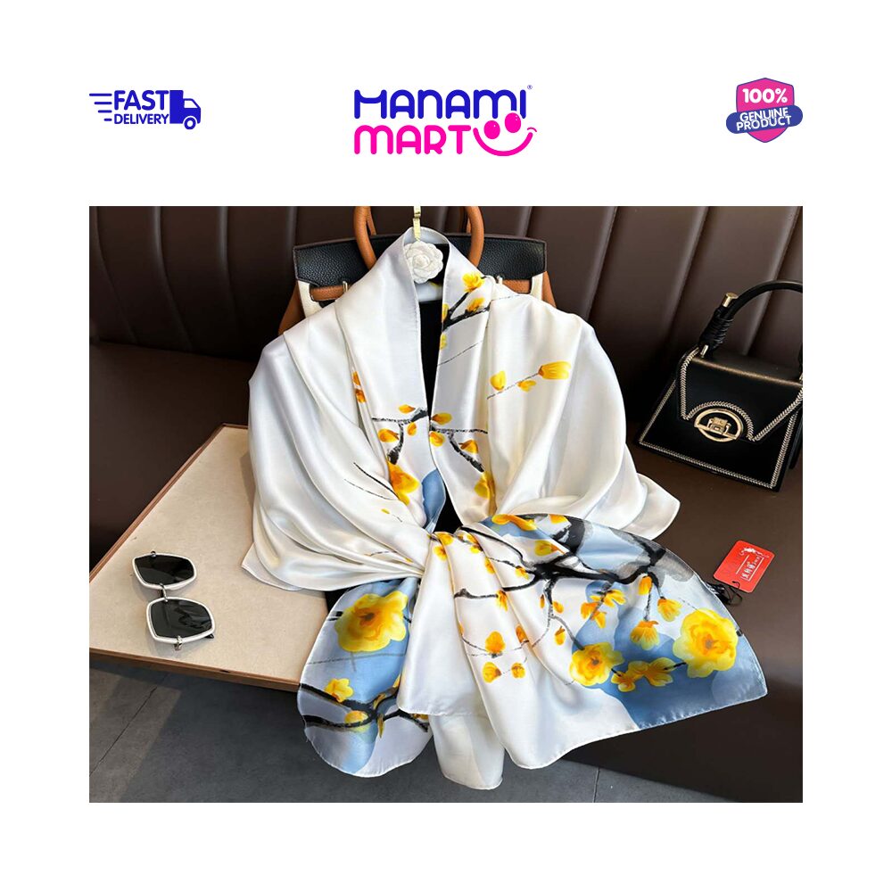 Silk Satin Printed Hijab designed in a soft white base featuring elegant yellow floral patterns and subtle artistic detailing. Crafted from smooth satin fabric, this hijab offers a lightweight and glossy finish that enhances both comfort and refined styling.